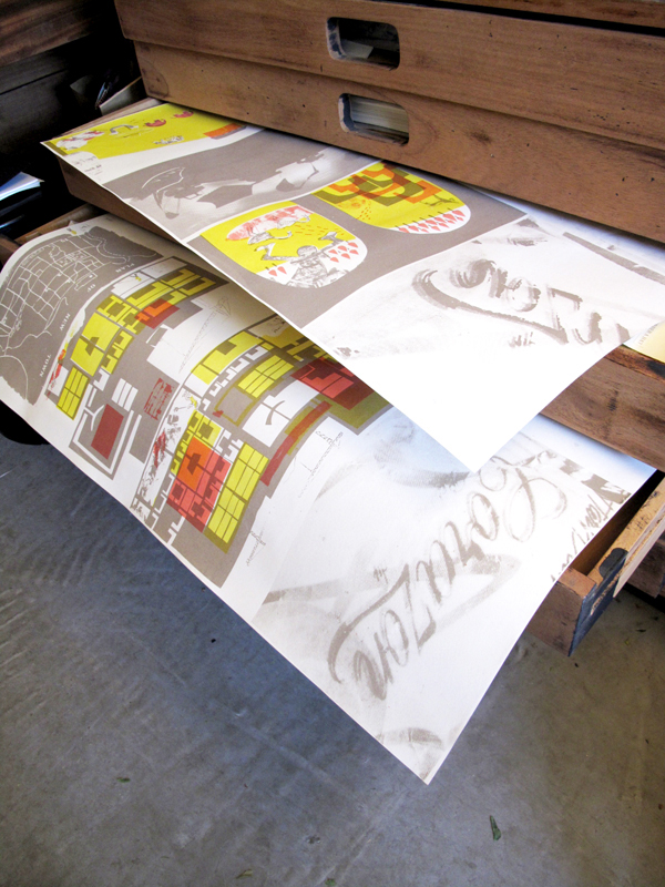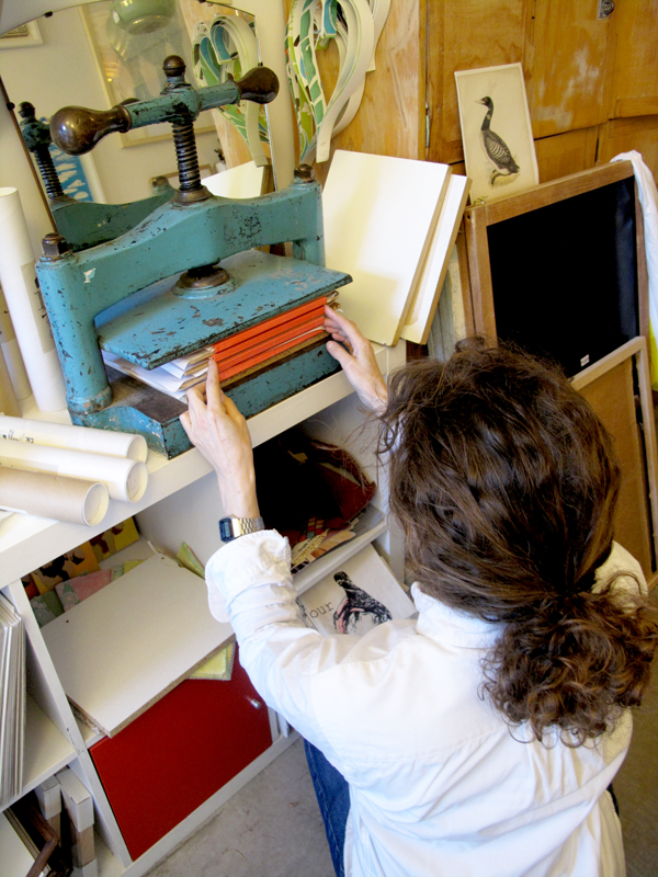 Liz often combines collage techniques with hand-pulled silkscreen to create the illusion of texture over a flat surface. Her books start life as A1 sheets of paper screen printed in 3 colours on both sides and finish as limited editions hand bound in cloth or card. Kingdom Under A Hat will be an edition of 650. These large sheets are then guillotined into double pages, arranged in order, folded with the bone folder, measured, hole punched and hand sewn to form the body of the book.