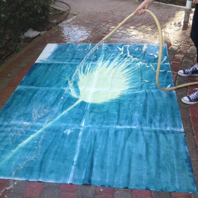To create a cyanotype a mixture of potassium ferricyanide and ferric ammonium are combined to create a photosensitive solution that is then applied to paper. This is allowed to dry in the dark to avoid exposure until it is ready to use. To create a print you must expose this coated paper to UV light, for example sunlight. This then creates a chemical reaction in the parts that are exposed to the light then darkening them. When fully exposed the chemical coated paper is then rinsed under running water. This washes away the unexposed chemical that was in shadow leaving a blank space, surrounded by the blue that was exposed to the light.